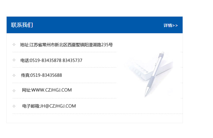 地址:常州市新北區友邦商務大廈1幢16、17層  電話:0519-85101652  傳真:0519-85112595  郵編:213022  網址:www_cz-jiayue_cn.jgsjg.com  郵箱:xiajifengaa@163.com